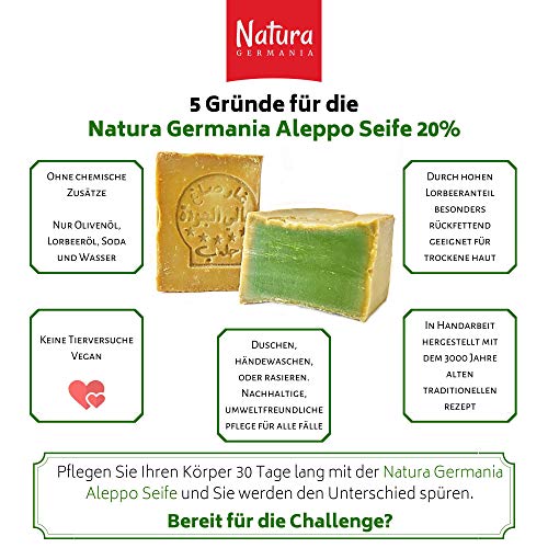 ✅ Verwen uzelf met een stukje luxe en welzijn. De 100% plantaardige natuurzeep van 80% olijfolie en 20% laurierolie – de Natura Germania “Aleppo Soap” is met de hand gemaakt volgens het traditionele recept van de kokende huizen van Aleppo – geen industrieel product. Extra lang gerijpt om huidvriendelijke PH-waarden van 8-9 te bereiken.