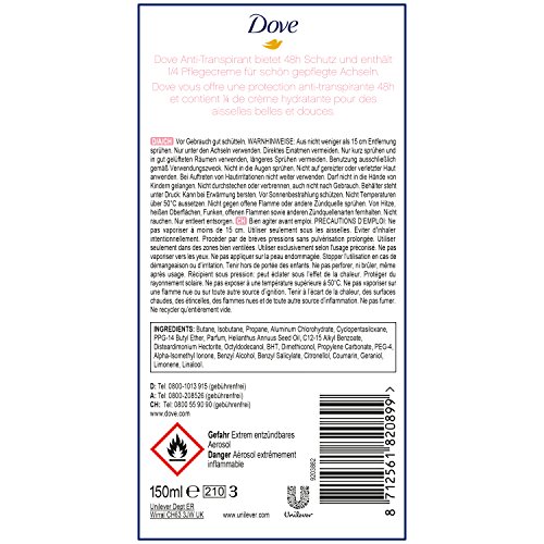 Specification: Dove anti-transpirantspray tegen lichaamsgeur en okselzweet, 48 uur, 6 x 150 ml