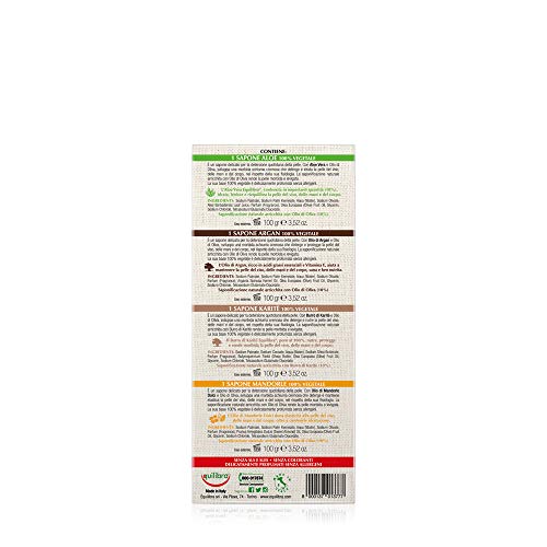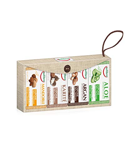 Het confect bevat: 1 aluminium zeep, 1 caritézeep, 1 arganzeep, 1 amandelzeep.