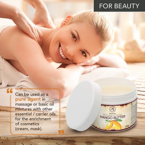 HOOGSTE KWALITEIT – De mangoboter is RIJK VITAMINE A EN E en VOEDENDE VETZUREN. Onmisbaar voor de dagelijkse haarverzorging, huidverzorging, gezichtsverzorging en lichaamsverzorging. Gebruik de mangoboter in combinatie met massagebehandelingen. De lichaamsboter is van nature dik en wordt langzamer geabsorbeerd, waardoor de crème tot diep in uw huid trekt voor de optimale verzorging. Voor anti-cellulitis behandelingen en striae. Vaak gebruikt in sectoren als wellness, SPA en beauty salons.