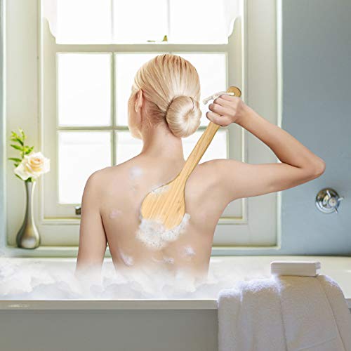 ✔【Lange natuurlijke bamboegreep】: ergonomisch, lang en krachtig, goed gepolijst, zonder bramen. Met deze borstel kun je gemakkelijk je rug, billen, voeten, benen en elk deel van je lichaam reinigen