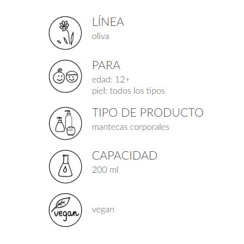 Oliva boter voor alle huidtypes. Vervult lipidetekorten en regenereert de natuurlijke beschermbarrière van de huid. Bovendien verbetert hij zijn elasticiteit en zachtheid zichtbaar en geeft hij zijn zijde en welzijn. Werkzame stoffen: vitamine E, OMEGA-3, OMEGA-6 Aanbevolen leeftijd: vanaf 12 jaar.